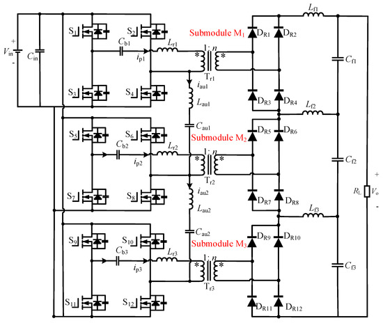 Series-parallel PSFB converters are usually driven in a synchronous interleaved manner and have the common advantages of both conventional PSFB converters and series-parallel combination converters, making them widely used in areas such as energy storage, renewable power generation, and high-voltage pulse generators [19,20,21]. Also using vertical-double-diffused metal-oxide-semiconductor field-effect transistor power devices on the primary side makes the series-parallel PSFB converter more attractive [22,23]. However, each converter submodule in a series-parallel PSFB converter still suffers from the problems of a conventional PSFB converter, which also limits its use to some extent [24]. Based on this, many scholars have proposed many solutions. An ISOP PSFB converter with auxiliary LC branches to realize a wide zero-voltage switching range has been proposed in the literature [25]. The ZVS of all switching tubes is realized by adding LC auxiliary networks at the midpoints of the leading-legs and lagging-legs between neighboring submodules. However, this method changes the driving method of the conventional PSFB converter and fails to realize the interleaving between the submodules, which increases the peak-to-peak output voltage ripple in high-power application scenarios, thus increasing the size of the filtering components. In literature [26] a fully soft-switching wide conversion range shunt full bridge structure converter is proposed. The full soft-switching of the active switching tube is realized by sharing the leading-leg under the dual control modes of primary-side phase-shifting and secondary-side phase-shifting. Moreover, since the dual full-bridge converter shares the leading-leg, it increases the current stress of the leading-leg and the dual control modes will make the system design more complicated, which reduces the reliability of the system. Article [27] presents a parallel variable inductor ZVS PSFB converter. The variable inductor is connected in parallel with the main transformer to realize the ZVS of the switching tube by utilizing the energy of the variable inductor under full load. Because the variable inductor is connected in series with the transformer, the volt-second product of the variable inductor is equal to the amplitude-second product of the transformer’s primary voltage. In high power and high voltage gain application scenarios, there is a large circulating current loss and the design of the variable inductor is complicated.