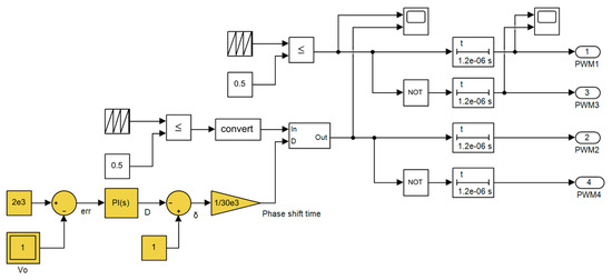 To validate the series-parallel PSFB converter lagging-leg ZVS strategy, a two-bridge 100 kW ZVS IPOS PSFB converter is modeled by the Matlab/Simulink simulator as shown in Figure 7 and Figure 8, and its model parameters are shown in Table 2. In the simulation, the controller is controlled by a single voltage loop, and a Proportional Integral (PI) controller is used to balance the output voltage. The control parameters of the PI controller are Kp = 0.0001 and Ki = 0.3.