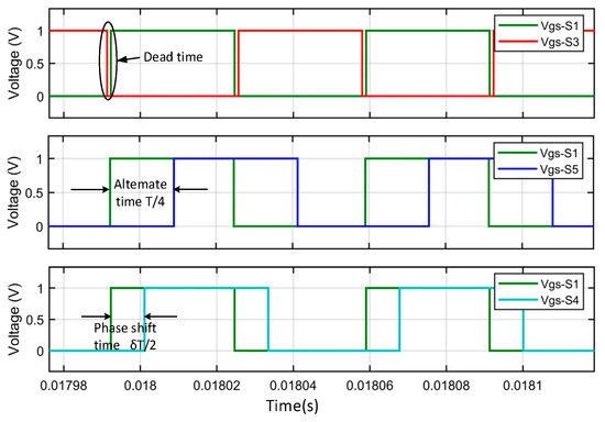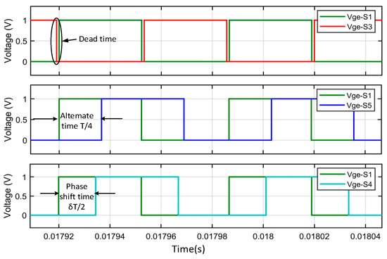 In a series-parallel PSFB converter consisting of n PSFB converter submodules, the interleaving angle of the corresponding switching tubes between two neighboring submodules should be π/n. So, in a series-parallel PSFB converter consisting of three PSFB converter submodules, the interleaving angle between two neighboring modules should be π/3.