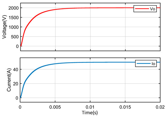 To analyze the reason for the difficulty in achieving ZVS for the lagging-leg at high input voltage and rated load, the steady-state analysis of the ZVS IPOS PSFB converter is implemented when the input voltage is 320 V at a rated load with 40 Ω load resistance. The driving voltage waveforms of the module are given in Figure 9, from top to bottom, the driving signals of the switch tubes S1 and S3 above and below the same bridge arm of the module, the driving signals of the corresponding switch tubes S1 and S5 between the sub-modules, and the driving signals of the diagonal switch tubes S1 and S4 under the rated power at the input voltage of 320 V. The output voltage and current waveforms are shown in Figure 10 with Vo = 2000 V and Io = 50 A at steady state.