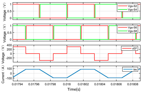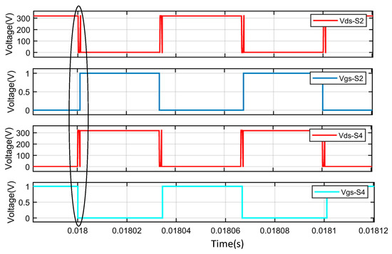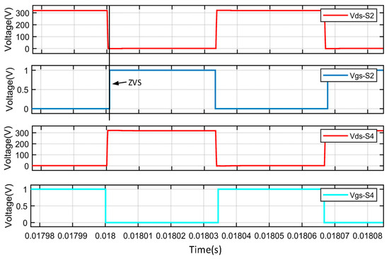 Figure 13 shows the voltage vEF, current iau of the auxiliary branch, and the driving voltage of the lagging bridge switch tubes of submodules M1 and M2 after adding the auxiliary inductor, and the maximum value of iau is 88 A when Vin = 320 V and Lau = 30 mH. The waveforms of drain-source voltage and gate-source voltage of the lagging bridge switch tubes S2 and S4, after adding the auxiliary inductor under the same working condition, are shown in Figure 14. It can be seen that the drain-source voltage has dropped to zero before the arrival of the drive signal of S2, thus realizing the ZVS of the craggy switching tube afterward.