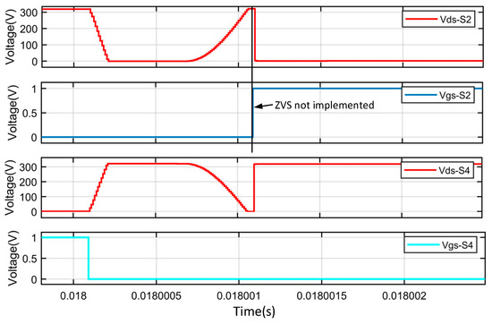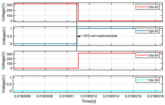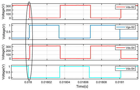 Figure 17 shows the realization of ZVS by the submodule M1 lagging-leg switch tubes S2 and S4 before the addition of the auxiliary LC branch at an input voltage of 320 V and a resonant inductance of 1μH under light load conditions. Figure 18 shows a partial enlargement of Figure 17 from Figure 18, it can be seen that the drain and source voltages Vds-S2 of switch S2 maintain the input voltage unchanged until the arrival of the gate and source signals Vgs-S2 and the ZVS of the lagging bridge switching tubes is not realized. The reason why the lagging-leg does not realize the ZVS under the light-load condition is that the energy of the resonant inductor is not enough to realize the charging and discharging of the junction capacitance of the switching tubes of the lagging-leg.
