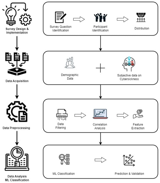 The study employed a structured approach to identify cybersickness in users experiencing a virtual environment. The steps involved designing a tailored web-based survey for data collection, preprocessing the collected data, and subsequently analyzing it using ML classification techniques. Utilizing an online survey methodology facilitated efficient data collection from a diverse participant pool, ensuring the reliability and validity of the gathered data. This approach allowed for firsthand insights from individuals engaged with VR technologies, broadening the study’s scope. The methodology, as shown in Figure 1, commenced with survey design and participant selection followed by data acquisition, including demographics and subjective responses. After preprocessing and filtering, the data underwent correlation analysis and feature extraction. Machine learning classification was then applied to progress to the prediction and validation phase to evaluate the model’s accuracy.