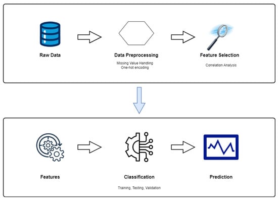 Data preprocessing is a crucial step in ML pipelines, as it can significantly impact an ML model’s performance and interpretability. Rigorous data preprocessing steps were undertaken to ensure data integrity and usability for machine learning applications. The preprocessing and application of ML classification on the data involved some steps that are shown in Figure 2.