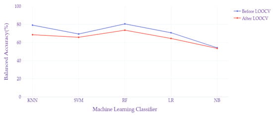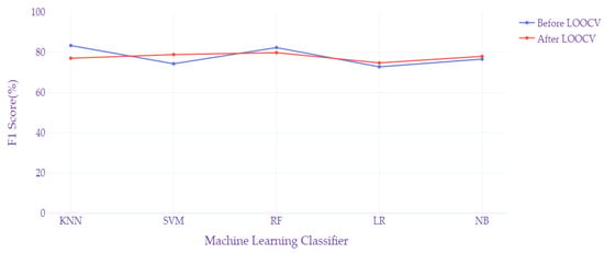 Figure 4 illustrates the F1 Scores for KNN, SVM, RF, LR, and NB classifiers. The performance is relatively consistent before and after LOOCV, with slight variations that suggest LOOCV had a minimal impact on F1 Scores.