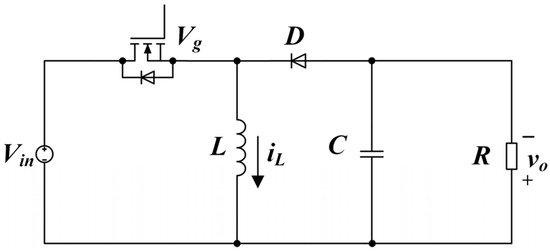 The circuit topology of the Buck–Boost converter based on PWM is shown in Figure 1. is the input voltage, is the switching tube, D is the relaying diode, L is the circuit inductance, C is the circuit capacitance, R is the circuit load resistance, is the inductive current, and is the load output voltage.