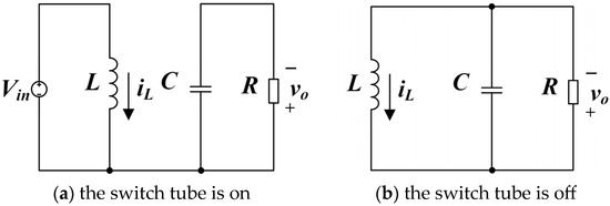 The Buck–Boost converter circuit is modeled using the state space averaging method in continuous inductance mode. When the switch tube () is switched on, the equivalent circuit diagram of the Buck–Boost converter is shown in Figure 2a. The power supply () is supplied at both ends of the inductor, the inductor current () increases linearly, the inductor (L) stores energy, the diode (D) is cut off, and the output voltage at the right end is maintained by the discharge of capacitor C. The circuit model is as follows: