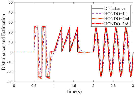Comparison of estimation performance of d1 and d2 among the first-order, second-order, and third-order NDOs.