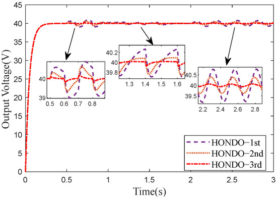 To verify the disturbance estimation ability of the proposed HONDO control strategy, simulation comparisons were conducted on three different orders of HONDO under three different disturbance types. Figure 4 shows the comparison of estimation errors for first-order, second-order, and third-order HONDO, and Figure 5 shows the output voltage waveform. It can be seen that the amplitude of first-order NDO is the largest, while that of third-order NDO is the smallest. The results indicate that the higher the order of HONDO, the stronger its anti-interference ability.