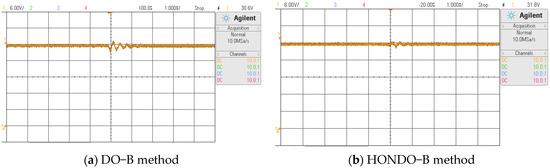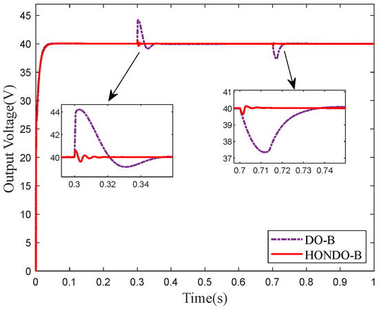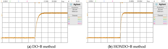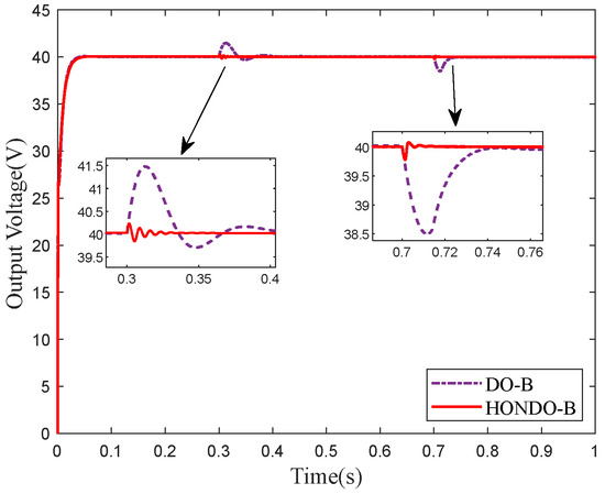 Firstly, measure the power of response. Figure 10 shows the transient response curve of the Buck–Boost converter, where Figure 10a shows the DO-B method and Figure 10b shows the HONDO-B method. From the figure, it can be seen that the output voltage rise times of DO-B and the proposed method are 0.03 s and 0.01 s, respectively. The proposed method can obtain a fast transient response.