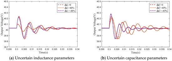 Considering that the actual inductance and capacitance parameters may be affected by operating time or environmental factors, and the system may be affected by model uncertainty, the robustness of the proposed control method with uncertain inductance and capacitance parameters is verified. Increase the inductance and capacitance values by 40% and decrease them by 40%, respectively. Figure 8 shows the output voltage response waveforms corresponding to different inductance and capacitance values when the load suddenly changes. Figure 8a shows the output voltage waveform diagram of different inductance parameters under sudden load changes, and Figure 8b shows the output voltage waveform diagram of different capacitance parameters under sudden load changes. From Figure 8, it can be seen that the proposed control method can eliminate the influence of model parameter uncertainty, maintain the stable output of the system, and quickly adjust back to a steady state in case of sudden load changes.