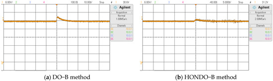 The next system testing is the input voltage variation. Verify the ability of the dual closed-loop HONDO-B control method to suppress system input voltage disturbances, increasing the input voltage from 40 V to 45 V. The load output voltage response curve is shown in Figure 12, where Figure 12a,b represent the output voltage under DO-B and HONDO-B control, respectively. The control performance indicators of the two control methods under sudden input voltage changes are shown in Table 2. From the comparison between the response curve in Figure 12 and the data in Table 2, it can be seen that the control method proposed in this paper converges faster, has smaller overshoot or overshoot, and stronger anti-interference performance when there is input voltage disturbance in the system.