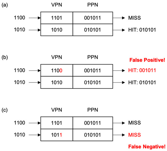 Illustration of soft errors in VPN information stored in TLB. (a) Correct TLB access, (b) false positive case, and (c) false negative case. The bits and corresponding outputs marked by red color exemplify the problems caused by bit flips.