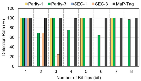 Figure 5 exhibits the detection rate changes from one-bit error to eight-bit errors. We evaluate our MaP-Tag design with the comparison of the other four protection schemes. All these five schemes can achieve a detection rate of 100% for one-bit error.