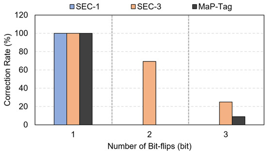 Figure 6 shows the correction rate results. Considering Parity-1 and Parity-3′s inability to correct errors, we only compare the MaP-Tag scheme with SEC-1 and SEC-3. All these three schemes can achieve an error correction rate of 100% for single-bit errors. SEC-1 cannot locate any errors beyond single-bit error cases and lacks the capability of multi-bit error correction. SEC-3 outperforms other schemes in error correction, detecting and correcting a few non-adjacent multi-bit errors with no more than three bit-flips.