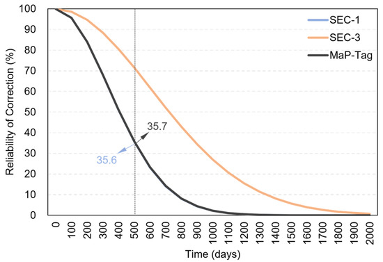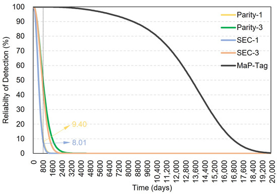 The reliability of our correction results is shown in Figure 8. Our MaP-Tag proposal has an approximate capability of error correction compared to the conventional SEC-1 protection scheme. The difference between SEC-1 and MaP-Tag is negligible, as seen in Figure 8. For simplicity of comparison, we extract the reliability values at 500 days. The reliability of MaP-Tag dwindles to 35.7%, while the reliability of SEC-1 drops to 35.6%. MaP-Tag outperforms SEC-1 in that MaP-Tag is capable of correcting a few multi-bit errors if they occur in the same row or column, which cannot be accomplished by SEC-1. Nevertheless, SEC-3 is the best protection scheme for error correction due to its ability to locate non-adjacent two-bit errors.