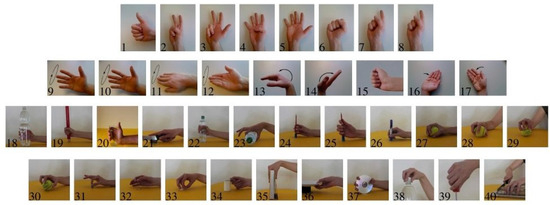 - Atzori, M.; Gijsberts, A.; Castellini, C.; Caputo, B.; Hager, A.-G.M.; Elsig, S.; Giatsidis, G.; Bassetto, F.; Müller, H. Electromyography data for non-invasive naturally-controlled robotic hand prostheses. Sci. Data 2014, 1, 140053. [Google Scholar] [CrossRef] [PubMed]