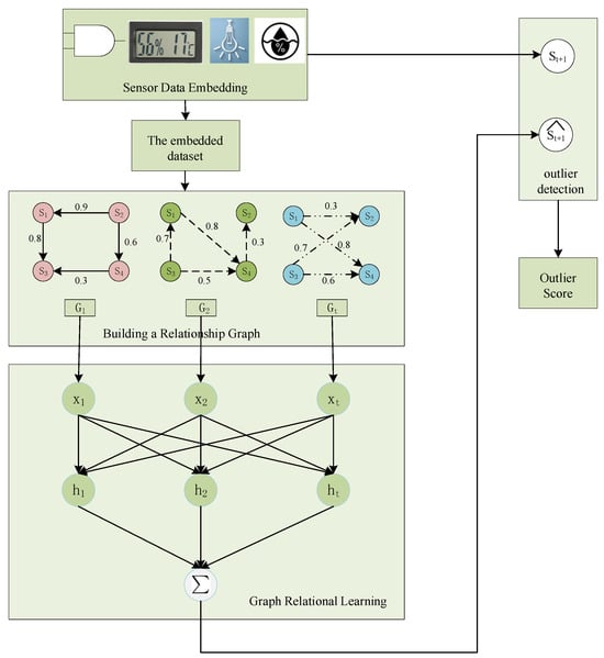 In our study, the training data consist of sensor data (a kind of multivariate time series) from sensors over time ticks. The training sensors’ data are indicated as which is used to train our proposed algorithm. At each time , the sensor data are . Similarly, the test dataset is denoted as being derived from N sensors over time ticks. This algorithm finally outputs a binary value: if it is 1, it means that there is an anomaly at that time tick; if it is 0, that moment is normal.