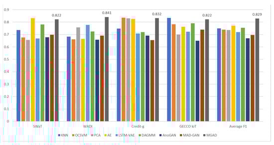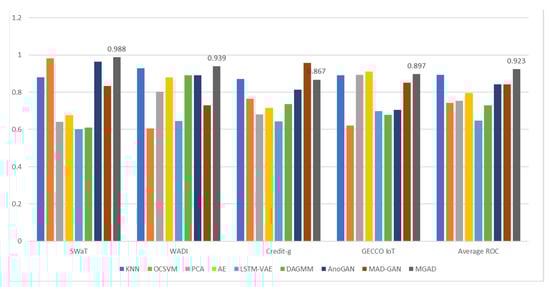 As can be seen from Table 2 and Figure 2, the MGAD algorithm achieved the best performance on the SWaT and WADI datasets, the third best performance on the Credit-g dataset, and the second best performance on the GECCO IoT dataset. Lastly, the MGAD algorithm had the highest average ROC.