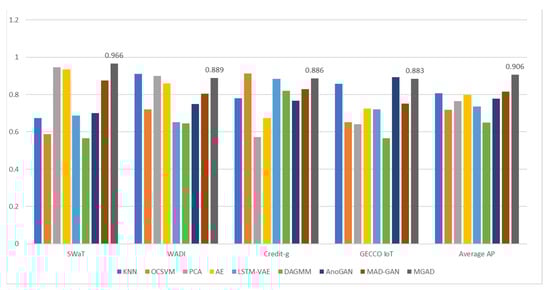 MGAD also has the highest average AP, which can be seen from the data in Table 4 and Figure 4. In all four datasets, MGAD’s algorithm is either the optimal or the front runner in terms of performance.