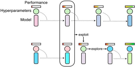 As shown in Figure 2, as the training of the neural network cluster continues, this process of development and exploration is also carried out periodically to ensure that all agents in the cluster have a good basic performance level and have been constantly exploring new hyperparameters. This means that PBT can quickly use good hyperparameters, allocate more training time to promising models, and, most importantly, adjust the hyperparameter value during the whole training process, thus automatically learn the optimal configuration.