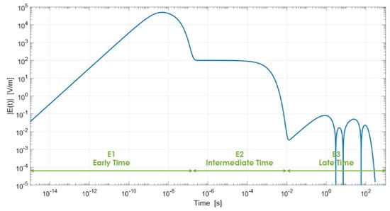 To analyze the transient response of the relay device, the simulated frequency domain results were convoluted with a time-dependent function that represented the HEMP E1 pulse. E1 was utilized over E2 and E3 pulses because it embodies the most severe hazards for digital equipment, such as protection relays. E2 can be mitigated with lightning surge arrester equipment, and E3 is more of a concern for reactive power consumption and saturation of magnetic components as a result of quasi-DC currents coupled to long lines. E1 consists of high-intensity field strengths over a wide frequency range, thus posing significant conducted and radiated threats, especially to equipment containing electronics []. The E1 pulse can be modeled as a fast-rising double-exponential signal. According to the IEC-61000-2-9 standard [], the E1 waveform as a function of time is defined as follows in Equation (4):