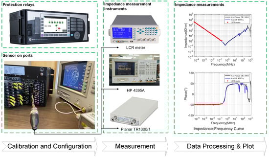 This research concentrated on key measurement points, including the 48 VDC output power port, the phase A-to-ground ports of the CT and VT modules, and the phase B-to-phase C port impedance. As elaborated in Section 3.3, initial raw impedance values were acquired from the three measurement devices. These raw results were then refined using interpolation and curve-fitting methods.