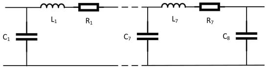 The equivalent circuit for the fixture, which was modeled as a seven-stage cascade of the wire propagation model, is shown in Figure 3. The key parameters of the fixture, namely, resistance, inductance, and capacitance, were determined using the open and short methods based on the impedance measurements taken. It is generally observed that a smaller distance between two wires results in lower inductance and higher capacitance.