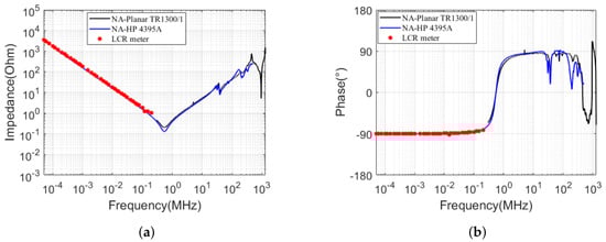 Once the de-embedding process was completed, the measured impedance values were obtained. The impedance results from each instrument, detailing both the impedance magnitude and phase angle, are presented in Figure 4a and Figure 4b, respectively.