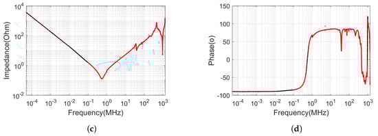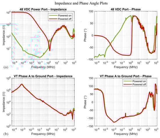 Considering the presence of nonlinear components within the power port, impedance measurements were conducted under both powered-off and powered-on operational conditions, as illustrated in Figure 8. The simulation results are discussed in Appendix A. During the measurements, the control power port of the relay equipment was powered by an 80–300 V signal, and the 48 VDC power port was activated to more accurately reflect its operational impedance. Given that the power port designs of the three relays were identical, Figure 8a adequately demonstrates the impedance results. Disparities in impedance outcomes were observed, especially within the lower frequency spectrum. From 10 Hz to 1 MHz, there was a significant reduction in impedance amplitude—by several orders of magnitude—while the phase angle gradually shifted from −90° to +90°. Conversely, for the frequency range of 5 MHz to 100 MHz, the impedance results of the powered-on condition were similar to the powered-off condition.