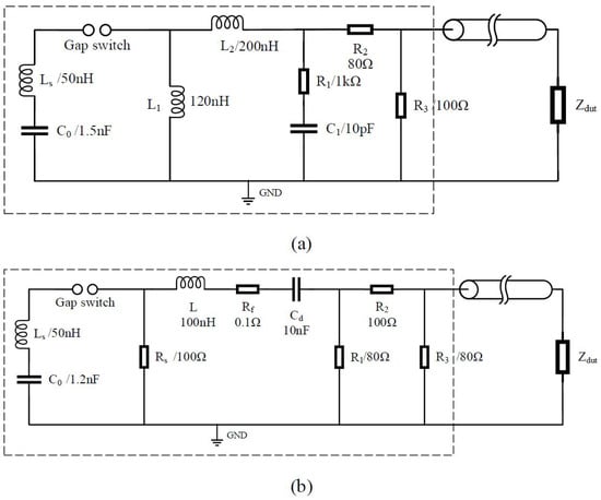 The simplified circuit diagram of the PCI generator for EC5 and EC8 test levels is depicted in the dashed box in Figure 5. To maintain a consistent output impedance close to 50 Ω across the frequency range, a resistor network (R1, R2, and R3) was utilized. Connecting the generator’s output to the relay-measured port impedance (Zdut) was a one-meter-long 50 Ω coaxial wire.