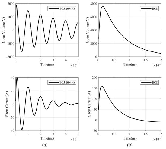 For the EC5 level, the oscillation frequencies of 3 MHz, 10 MHz, and 30 MHz were available. Displayed in Figure 6a, the 10 MHz waveform showed an open-circuit voltage and short-circuit current when the main capacitor was charged to 7.2 kV. The open voltage measured around 2000 V, and the short current was 40 A. The traditional definitions of short circuit and open circuit states that the load is set to 0.1 Ω and 1 kΩ, respectively. Similarly, Figure 6b presents waveforms for the short current and open voltage when the main capacitor was charged to 19.2 kV. The open voltage was less than 8 kV, and the short current was 160 A.