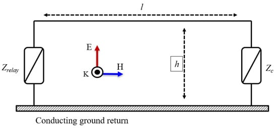 As stated previously, Altair FEKO version 2022.3.2 is the EM analysis software tool utilized in this paper to simulate an EMP surge that couples onto a conducting line and relay device in the frequency domain. In the simulation, the excitation was modeled as vertically polarized plane wave radiation with an incidence of 15 degrees from the ground plane. A wide bandwidth of 1.3 GHz was considered for the analysis. A single wire above the conducting ground transmission line was modeled. Both the ground plane and wire were assumed to be perfect electric conductors (PECs). Figure 7 visualizes the transmission line model and plane wave radiation excitation source. With the plane wave radiation, the electric and magnetic fields propagate in the K direction and are perpendicular to each other. As illustrated in the Figure 7, the different colors serve as distinction between the electric (E) and magnetic (H) fields. The length l and height h were 10 m and 3 m, respectively. The radius of the line a was 5 mm. The was the frequency-dependent impedance of the various relay ports represented as a Touchstone file.