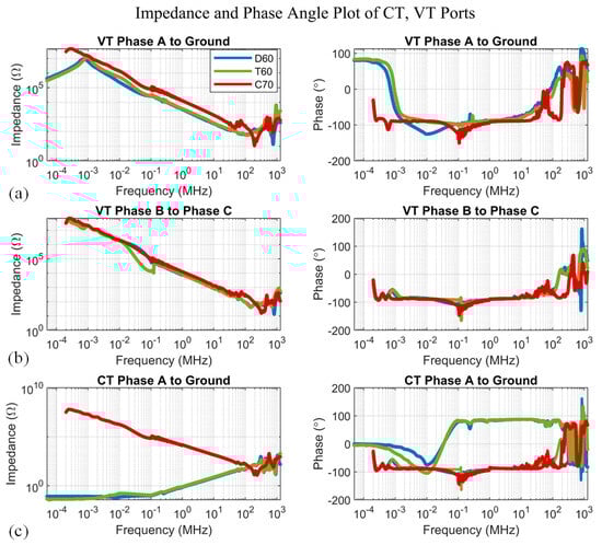Impedance and phase angle measurements for VT and CT: (a) VT phase A to ground, (b) VT phase B to phase C, and (c) CT phase A to ground.