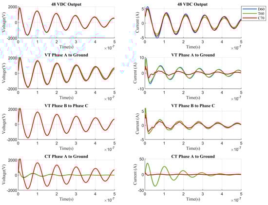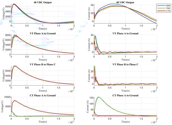 Regarding the PCI method, Figure A1a,b show the EC5 and EC8 immunity test results for the energized 48 VDC and VT phase A-to-ground ports. As shown in Figure A1a, very small changes in current were observed for the 48 VDC port, while the voltage response remained same as when the unit was powered off. For the EC8 test level, the voltage was slightly decreased and the current through the 48 VDC port was increased by 20 A. The voltage and current responses of the VT phase A-to-ground port remained similar to the results when the unit was turned off.