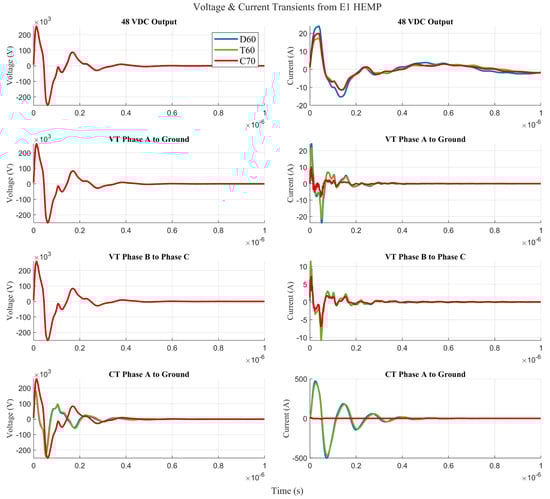 The transient response of the relay devices after an E1 event is depicted in Figure 12 below. The transient died out well before 1 μs for all ports, except the 48 VDC output port. The simulation was carried out to 2 μs, while the results are displayed out to 1 μs, as no late-time behavior was observed. The voltage reached above 200 kV for all ports. The CT port developed currents exceeding 400 A, while the rest of the ports developed currents below 30 A. For most ports, each device exhibited a similar response. However, the C70 relay CT port developed a very different transient when compared with the other devices. This could have possibly been due to the absence of the automatic shorting module within the C70 itself. Additionally, the C70 device exhibited a less intense current transient through both VT ports while maintaining a similar trend with the other devices. Simulation convergence was observed when the frequency increment was at or smaller than approximately 250 kHz. Therefore, 6471 frequency analysis points were used, resulting in a frequency spacing increment of 200 kHz.