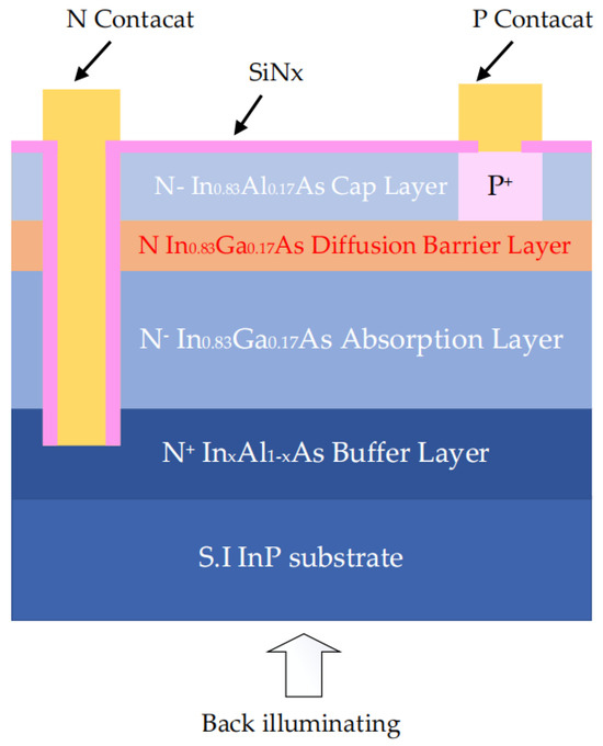 InP-based InGaAs alloys are characterized by their elevated absorption coefficients, enhanced electron mobility, superior physicochemical stability, and robust resistance to radiation exposure. The photodetectors (PDs) fabricated using these alloys exhibit a range of advantageous properties, including elevated operational temperatures, heightened quantum efficiency, and augmented sensitivity [1,2,3]. These attributes render them a significant option for applications in short-wave infrared (SWIR) detection. In near-wave infrared (NWIR) detection, the design and fabrication of high performance InGaAs PDs has been previously reported [4]. High-indium (In) InxGa1−xAs (x > 0.53) PDs covering the longer part of the SWIR wavelength (1.7–3 μm) range have attracted much attention in remote sensing, including in applications such as Earth resource observation, environmental monitoring, and night vision [5,6,7,8,9]. InGaAs PDs are favored due to their high sensitivity, rapid response time, and superior performance in the near-infrared region. One of the crucial concerns with InGaAs-based SWIR PDs is the lattice mismatch between the high-In InGaAs absorption layer and the InP substrate. For metamorphic InGaAs PDs, InGaAs with In content of 0.85 grown on GaAs substrates using an interfacial misfit array-based simple buffer has been previously reported [10]. The lattice mismatch rises up to about 2.5% for the InGaAs with In content of 0.83. The deterioration in material quality caused by lattice mismatch constrains enhancements in device performance. To improve PD performance, various kinds of buffer structures [11,12,13] are used to mitigate the effects of lattice mismatch. Additionally, electron barriers such as AlGaAsSb [14] and superlattice structures within the absorption layer [15] have also been reported. Moreover, the material structure of the infrared detector is adjusted by inserting layers for mid-wave infrared (MWIR) detection. High-performance InAs0.91Sb0.09 detectors decrease the dark current with the introduction of the AlAs1−ySby graded barrier layer [16]. Further, nBn InAs/GaSb type-II superlattice PDs with a stepped absorber have been proposed to enhance the extraction of photogenerated carriers from the active layers [17]. The structural designs have been proven to be effective in improving PD performance.