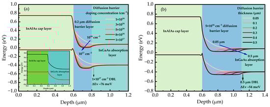 The energy band diagram as a function of (a) doping concentration (, , , , and cm−3) and (b) the thickness (0.05, 0.1, 0.2, 0.3, 0.4, and 0.5 μm) of the DBL at a biased voltage of 0 V. The inset shows the energy band diagram without the DBL at 0 V.