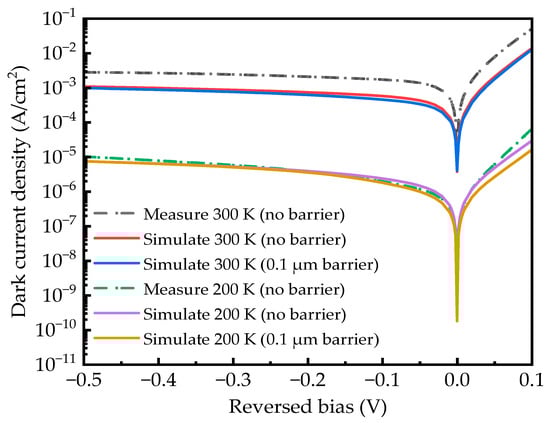 Figure 3 shows the simulated temperature-dependent dark current density–voltage (J-V) curves for the PD structure with a 0.1 μm thick DBL doped at cm−3 at 300 K and 200 K. Additionally, the measured J-V curve of the InGaAs PD reference sample without the DBL is also plotted in Figure 3. At the reverse bias of −10 mV, the simulated dark current density values of the PD structure without the DBL and the PD with a 0.1 μm thick cm−3 DBL structure are about 1.43 × 10−4 A/cm2 and 1.15 × 10−4 A/cm2 at 300 K, respectively, while at 200 K, the values are about 4.01 × 10−7 A/cm2 and 2.52 × 10−7 A/cm2, respectively. The measured dark current density of the PD without the DBL is 4.84 × 10−4 A/cm2 at −10 mV at 300 K and 3.49 × 10−7 A/cm2 at −10 mV at 200 K in the experiments. It can be also seen that the simulated curve of the dark current density of the reference sample is only a little bit lower than the measured one at 300 K. The difference may be due to the surface dark current, which is not taken into account in the simulation. At 200 K, the measured curve almost overlaps with the simulated one, indicating a high degree of accuracy in our simulation parameters and models.