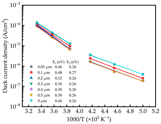 Figure 4 shows the Arrhenius plots of the temperature-dependent dark currents at −10 mV for PDs with DBLs of different thicknesses at the doping concentration of cm−3. Thermal activation energy Ea is obtained by linearly fitting the simulated data in Figure 4. The fitted Ea values are all close to 0.50 eV in the temperature range of 260–300 K, represented as E1 in the figure, which is close to the In0.83Ga0.17As bandgap of 0.48 eV, indicating a diffusion-dominant behavior in the temperature range of 260–300 K. On the other hand, the fitted Ea values are all close to 0.26 eV in the temperature range of 200–240 K, as represented by E2 in the figure. This indicates that the generation–recombination current is the dominant dark current for this lower temperature range. Compared to the PD without the DBL, the dominant dark currents stay the same with the introduction of the DBL in the PD for the temperature range between 200 and 300 K.