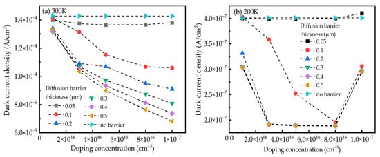 Dark current density as a function of doping concentration for different thicknesses of DBL at (a) 300 K and (b) 200 K. The dark current density of the PD structure without the DBL is also plotted for comparison.