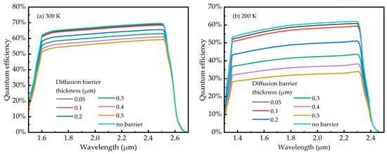 The simulated quantum efficiency of the In0.83Ga0.17As/InP PD with the DBL doped at cm−3 at (a) 300 K and (b) 200 K.