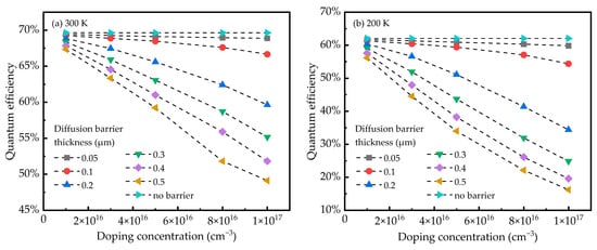 The influence of thickness and the doping concentration of the DBL on quantum efficiency at (a) 300 K and (b) 200 K.
