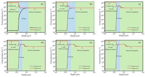 Electron and doping concentrations for the PD with different thicknesses of DBL at the doping concentration of cm−3 under zero bias at 300 K. The blue area represents the depletion region in the DBL and the In0.83Ga0.17As absorption layer. The widths of the depletion region and the thicknesses of the DBL are marked on each of the figure (a–f).
