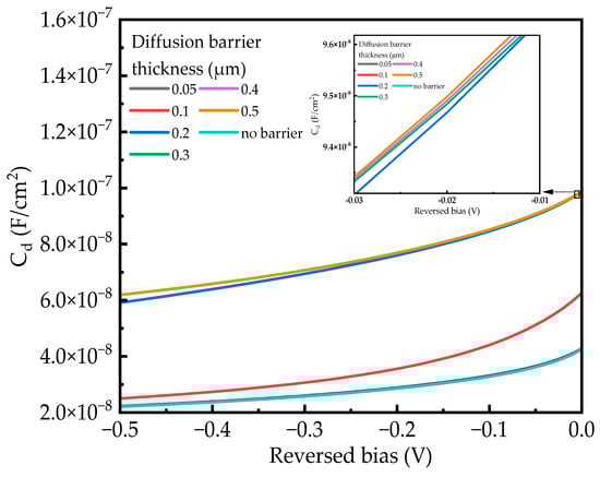 The capacitance Cd as a function of the reversed bias for different thicknesses of DBL at the doping concentration of cm−3 at 300 K. The inset shows an enlarged view of the overlapped curves.