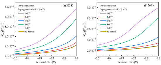 Furthermore, as the doping concentration of the DBL increases, the minority carrier lifetime () experiences a notable reduction [21]. The reduced value could result in diminished diffusion length according to the relationship of , where is the diffusion length and is the diffusion coefficient. The decrease in quantum efficiency as well as diffusion length is more noticeable at the lower temperature of 200 K [31].
