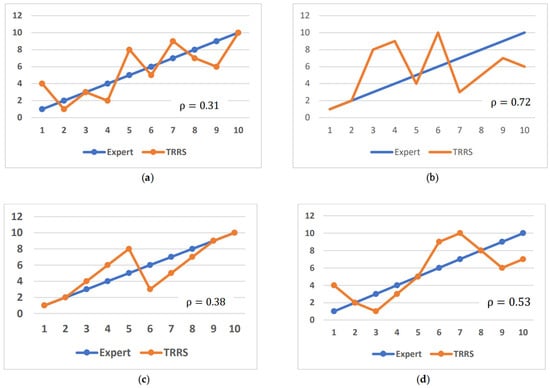 In our experiment, we selected the top 10 reviews using the TRRS for the three products, and we then compared the result with the experts’ ranking (Figure 3). The blue lines in each sub-figure of Figure 3 denote the review results from the experts for the three products, which were the baseline for comparing the review results obtained using the TRRS. The red lines in Figure 3 denote the ranking of the reviews for the three products. The Spearman’s rank coefficient, , which was used to measure the correlation between the experts’ opinions and the TRRS results, is shown in each sub-figure. The smaller the value of , the higher the correlation.