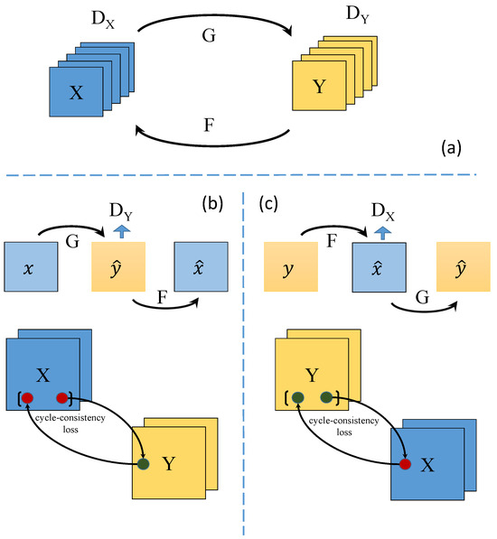 Figure 2. The basic structure of CycleGAN. (a) cycle structure. (b) the structure of generator for x. (c) the structure of generator for y.