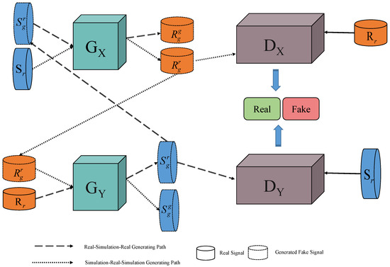 Based on the concept of the CycleGAN network, we utilize this network architecture to enhance the electromagnetic (EM) signals leaked from cryptographic integrated circuits. Through adversarial learning between limited real collected signals and simulated signals, we have designed an EM signal enhancement model called EME-CycleGAN. The specific model is illustrated in Figure 3. In the enhancement process, two generator networks are employed: G X : S i m u l a t i o n R e a l , G Y : R e a l S i m u l a t i o n . At the same time, two adversarial discriminators are used to distinguish between real data and generated fake data. D x is responsible for discriminating real signals R r and fake real signals R g r generated from simulated signals. D y is used to distinguish simulated signals S r and fake simulated signals generated from real signals S g r . S g g is the last generated simulated signal in the Simulation–Real–Simulation Path, while R g g is the last generated real signals in the Real–Simulation–Real Path.