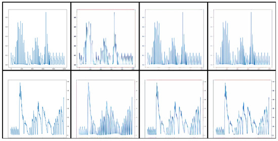 Using the Visdom visualization tool, we obtained the visual output of the EME-CycleGAN training process as shown in Figure 8. From left to right in the first row are S r , S g , r e c _ S and i d t _ S , and in the second row from left to right are R r , R g , r e c _ R and i d t _ R . Here, the rec and idt are defined as CycleGAN in [27]. In Figure 9, the first row shows the signal statistics of the original true signal and the original simulated signal. The second and third rows show the statistical results of the corresponding dataset in the EME-CycleGAN network, respectively.